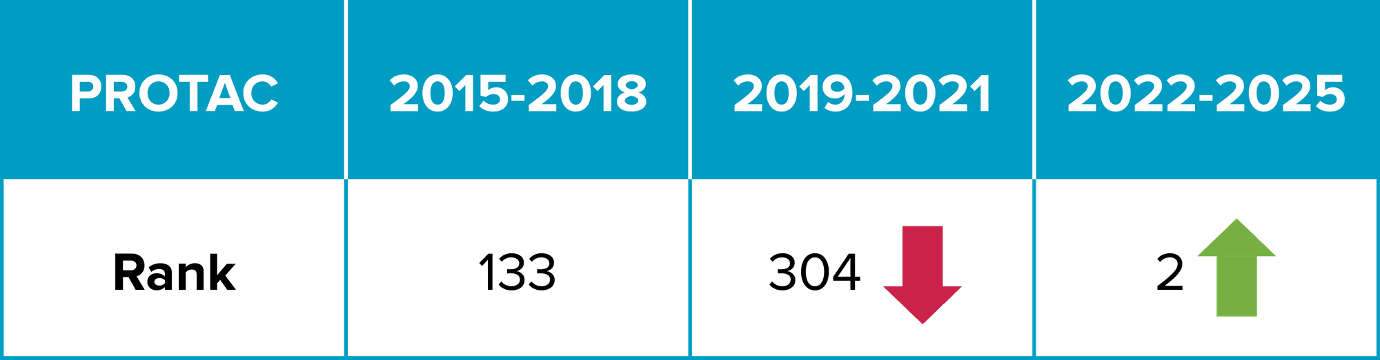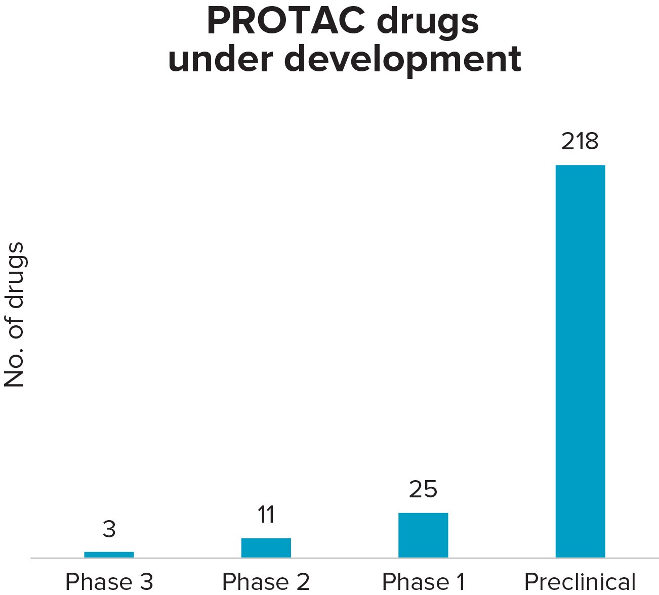 PROTACs eliminate, rather than inhibit, disease-driving proteins.They are bifunctional molecules that recruit an E3 ubiquitin ligase to tag the target protein for degradation by the proteasome. After the target is destroyed, the PROTAC is recycled to initiate further rounds of degradation.