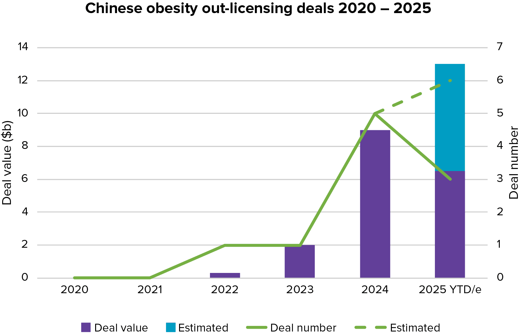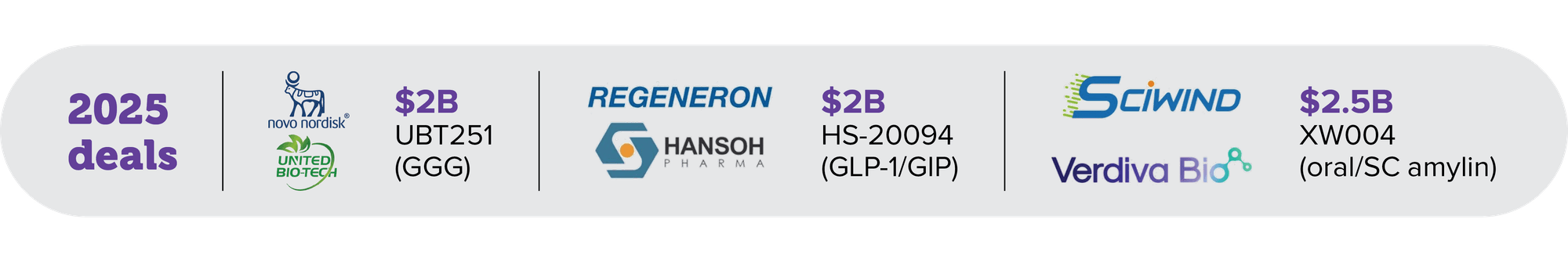 The role of China in the broader biopharma landscape in the past five years is reshaping the global market. Obesity is no exception and China has emerged as a vital source of innovation in the space. In 2024, out-licensing deals from Chinese firms totaled $9 billion, and 2025 is on track to surpass that figure. Chinese companies are developing high-quality GLP-1 and amylin analogues, often at lower cost than Western counterparts.