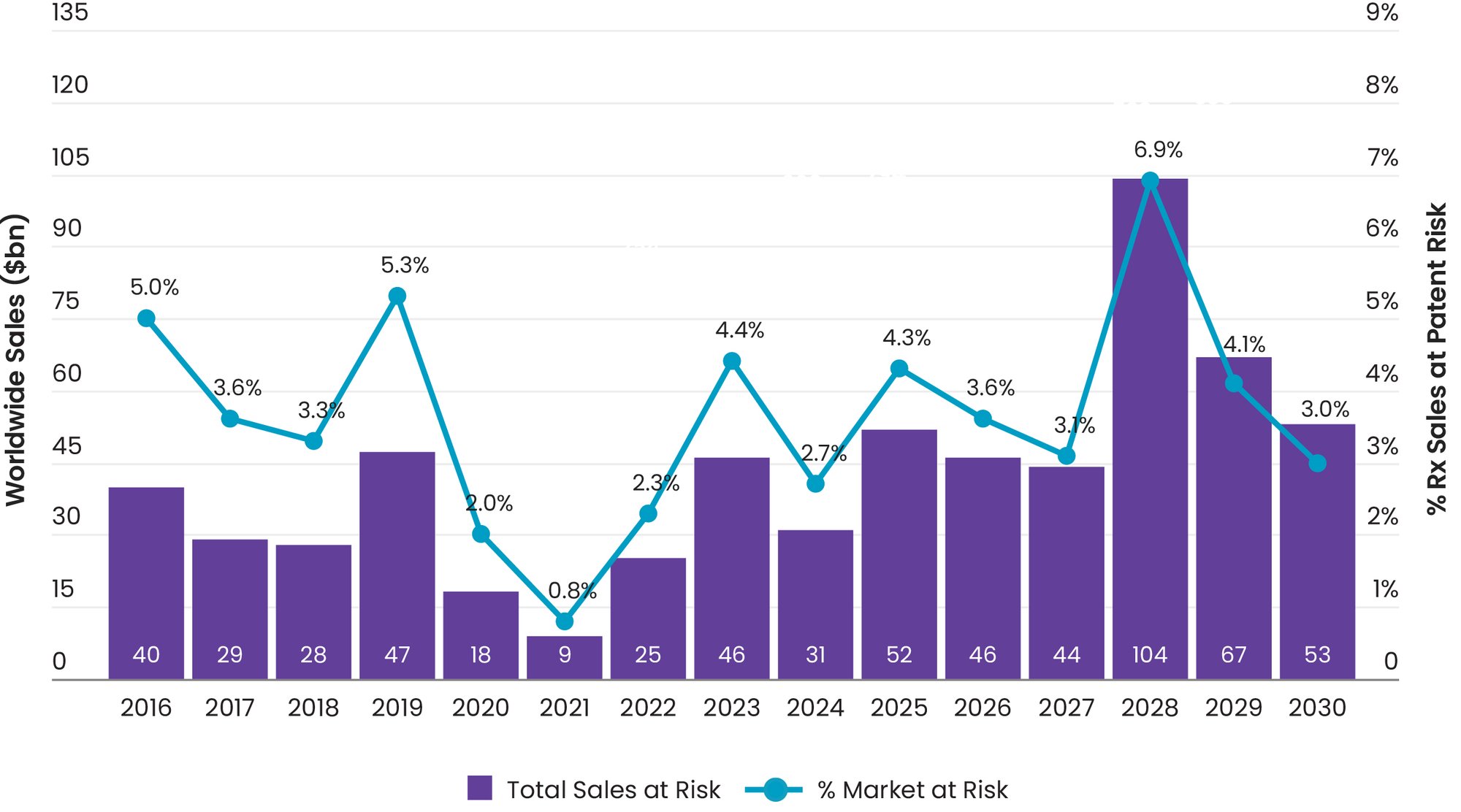 Each upcoming year sees more than 3% of total revenues facing end-of-lifecycle competition from generics or biosimilars.
