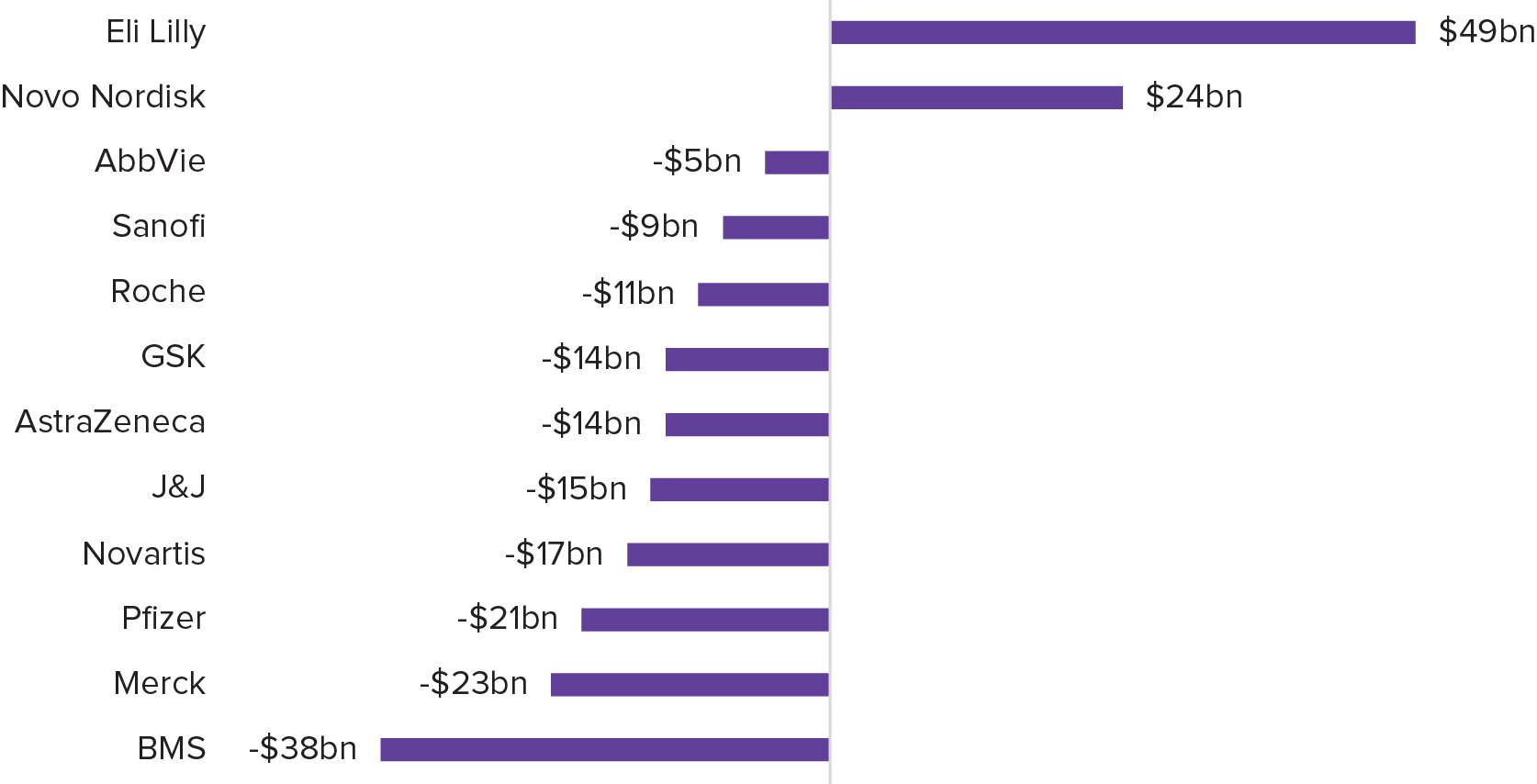 Of the companies in the middle ground, AstraZeneca is an interesting case study. Its leadership has often spoken of an $80bn revenue target by 2030, having achieved an ambitious transformation after fending off a potential acquisition by Pfizer. The gap between Evaluate’s current consensus for AstraZeneca and this $80bn target is $15bn, which is nearly identical to our calculated growth gap of $14bn. In our view, this validates the growth gap analysis and indicates that large pharma leadership views 7%+ CAGR as an achievable goal, even without meaningful participation in the GLP-1 market.